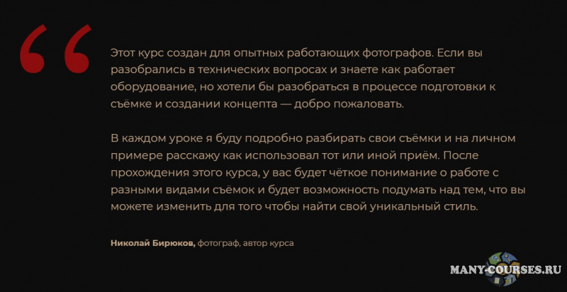 Этот курс создан для опытных работающих фотографов. Если вы разобрались в технических вопросах и знаете как работает оборудование, но хотели бы разобраться в процессе подготовки к съёмке и создании концепта — добро пожаловать.